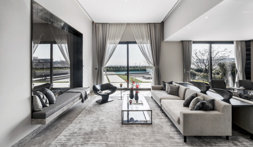 遵循原始空間的中軸對稱與環(huán)形形式,擒縱高爾夫運動的動態(tài)意向,MDO以拋物線為靈感,體驗中心設(shè)計將入口視作起點,將擊球后的高飛剎那定格于接待中心?!鹅F嶼》裝置幻化出超然于任意球體的清澈靈動。墻體的立面曲率與懸掛的裝置曲率相平衡。墻壁的雕塑性、延展性,為空間帶來了更為軟性和流動的感官體驗,與地面石材的堅固物質(zhì)性形成鮮明對比。裝修設(shè)計