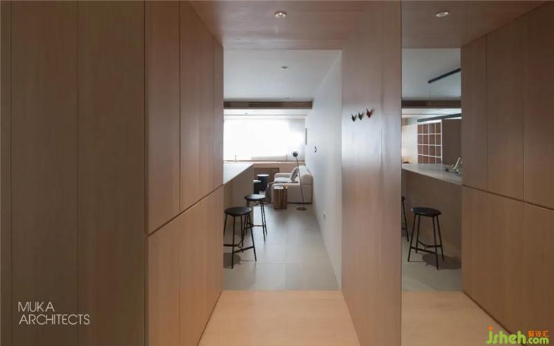 The No. 1 maple box is located at the entrance hallway. The hallway space is separated by the wood veneer of the ceiling, floor and wall, and the storage function is integrated, which serves as the center of movement.