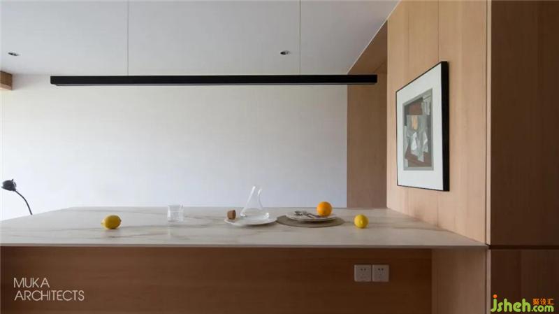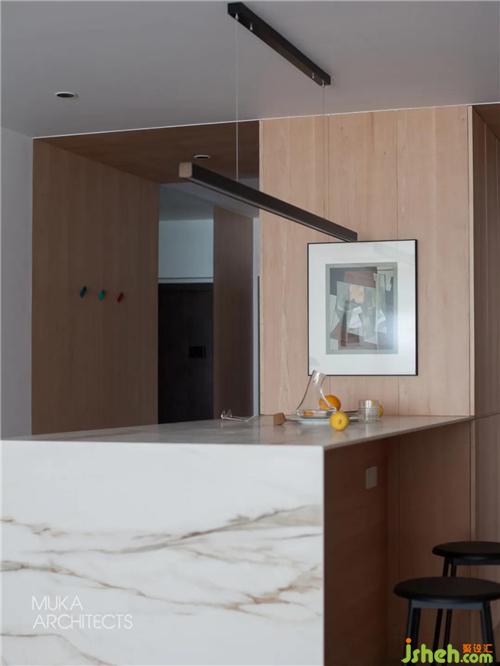 The imported rock slab at the entrance is equipped with a central island for a series of main family activities such as a dining table, a bar, reading work, and future living activities. It is the visual center, and the perfect connection with the maple box No. 1 has become a good migration Moving line.