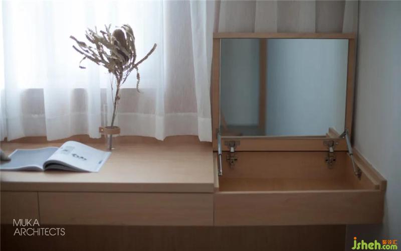 The cabinet on the entire surface of the tatami room continues as a desk, creating a visual break of the recess, and then using the mirror to strengthen the visual experience to have a deeper extension. In addition to the necessary washing and changing clothes, the decorative mirrors used throughout the house are lower or higher than people's daily sight.