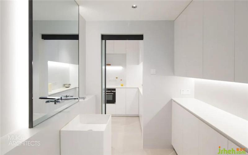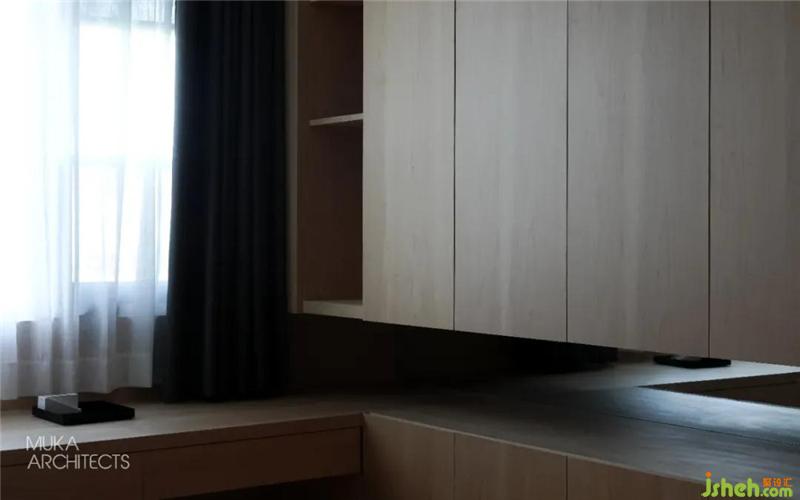 榻榻米房間整面的收納延續(xù)書桌關(guān)系做了一個置物凹口的視覺打破,再利用鏡面強(qiáng)化使感受上有了一個更深的延伸上海裝修設(shè)計。除了必要的盥洗與更衣。全屋使用的裝飾性鏡面元素原則上都是遠(yuǎn)遠(yuǎn)低于或高于人的日常視線。