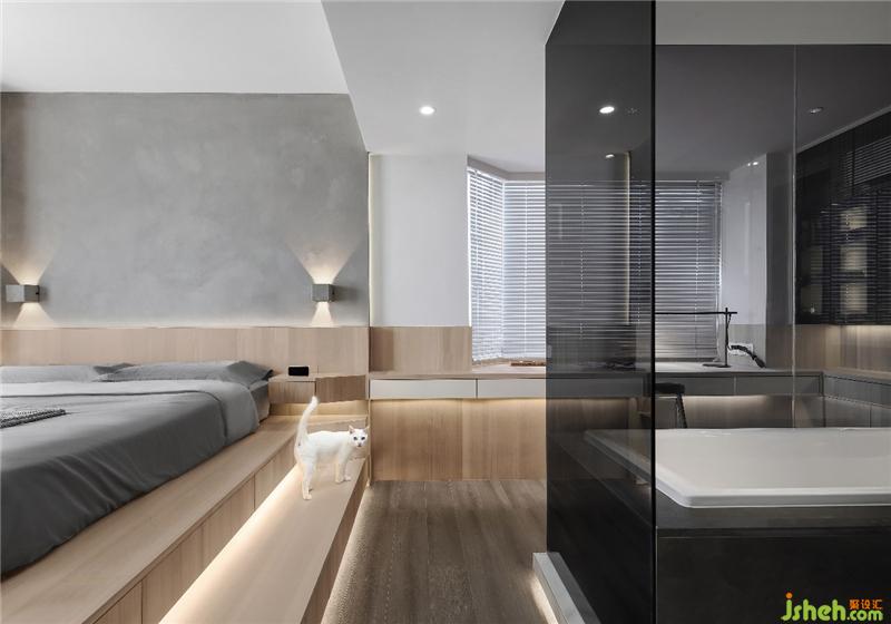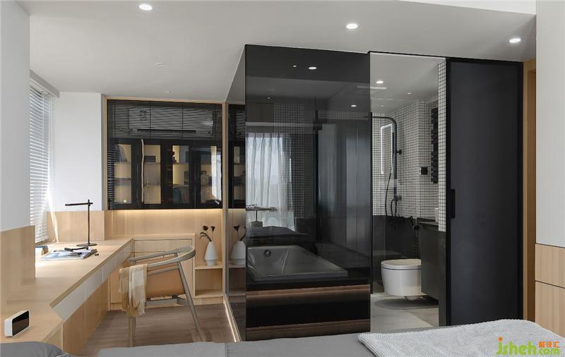 衛(wèi)生間作為一個獨立的盒子設(shè)計,打破傳統(tǒng)的隔墻,改為黑色玻璃,強化區(qū)域界線的同時,也提供了視線交流的可能性,不同空間呈現(xiàn)出不同的生活情境,且能夠視線無遮擋的交流溝通。半通透的黑色玻璃,方便清潔的同時,讓衛(wèi)生間增加了一絲神秘感和情趣!