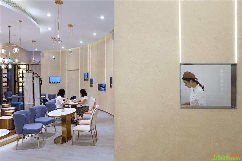 主要材料:藝術涂料、意大利白金砂大理石、瓷磚、夾絲玻璃、玫瑰金不銹鋼、亞克力