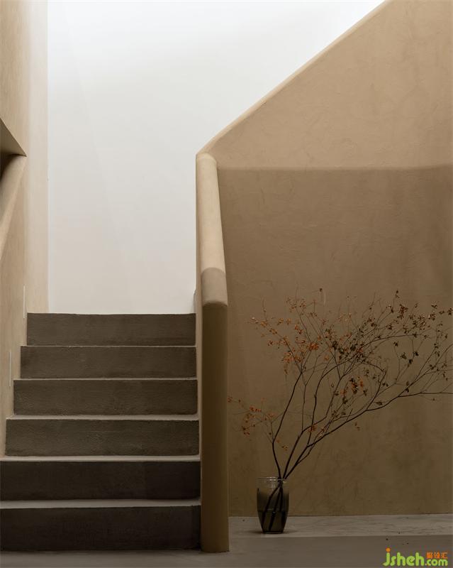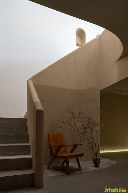 土黃色的藝術(shù)涂料包裹著樓梯空間,宛如從地面生長出來,展廳設(shè)計曲面的造型讓粗獷的墻面柔和了許多,在光影作用下,如雕塑搬的存在。