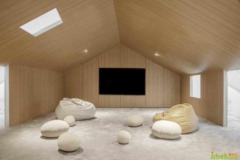 休息區(qū)以沉靜的灰色細(xì)部和輕柔的線條營(yíng)造安靜的氛圍,轟趴民宿設(shè)計(jì)讓不希望被打擾的人盡可能地放松身心。逃離了城市的喧鬧,生活的壓力,設(shè)計(jì)師有意引導(dǎo)人們把節(jié)奏放慢,在山野深處能將自己舒展開來,返璞歸真,為心靈提供庇護(hù)港灣。