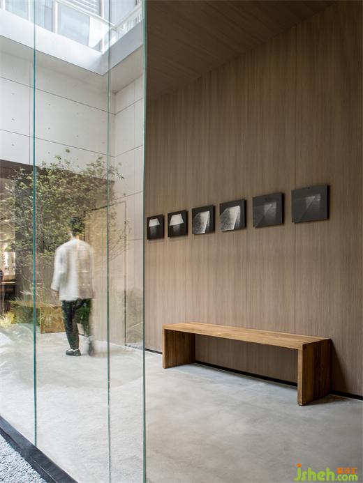 多個空間圍繞同一處景觀不同的取景方式,暗示了不同空間及其中家居各異的風格調(diào)性。為了使室內(nèi)空間均質(zhì)化,目心設計在不同風格房間中使用一致的材料來營造出純粹的空間氛圍。為了消除現(xiàn)代混凝土帶來的冰冷感,設計師利用燈光散發(fā)出柔和協(xié)調(diào)的光芒,呼應了空間氛圍。