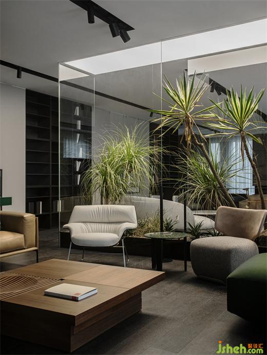 杭州總部展廳設計以植物作為通透隔斷的展示區(qū)域,為整體空間帶來生機與活力,仿佛空間在這里可以自由呼吸,形成一種透氣感??此坪唵蔚目臻g因為細節(jié)處理和材質肌理而變得更有質感。