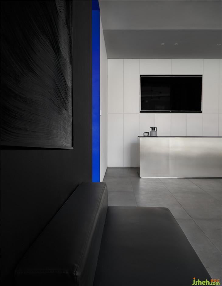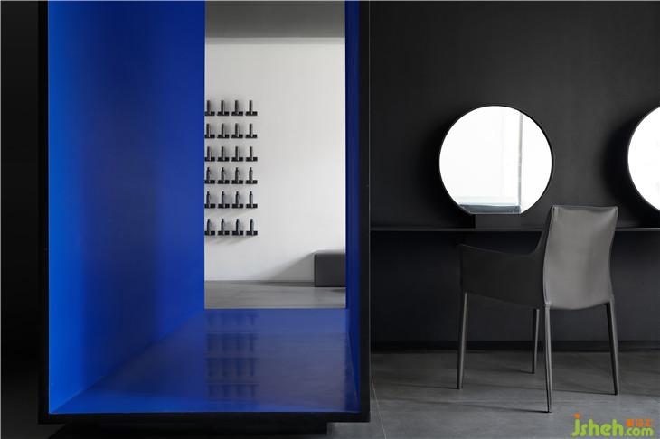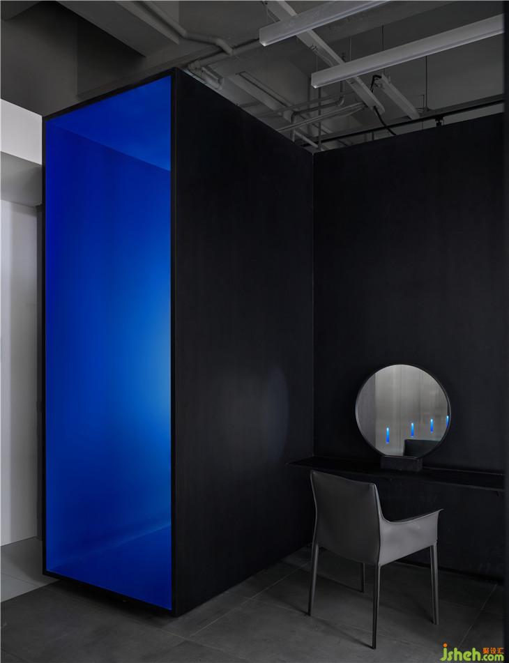 設(shè)計(jì)師在洗、剪區(qū)域之間的墻體下方預(yù)留了五個洞孔,室外的光線能夠不動聲色地進(jìn)入洗發(fā)區(qū),后經(jīng)克萊因藍(lán)的過濾,輕薄光線在黑暗中交疊、滲透,引導(dǎo)客人行徑之余竟有一種欲說還休的美。