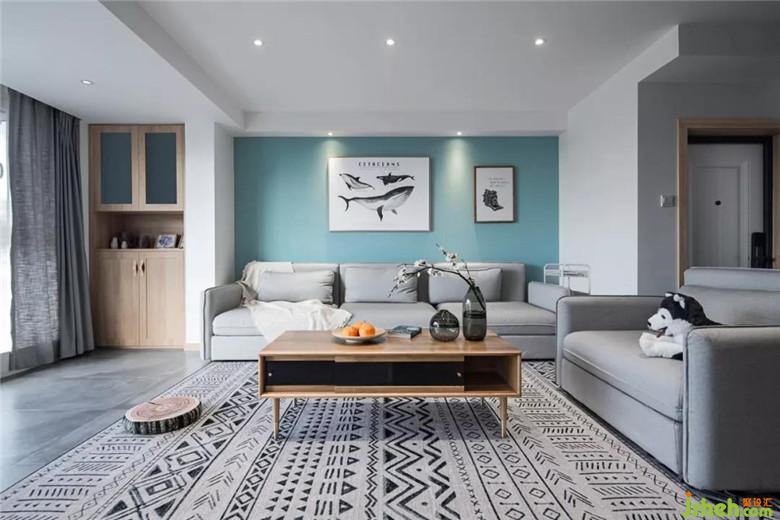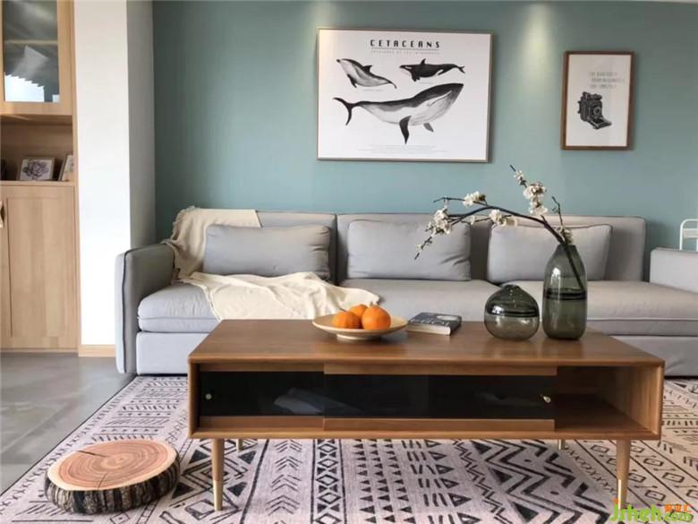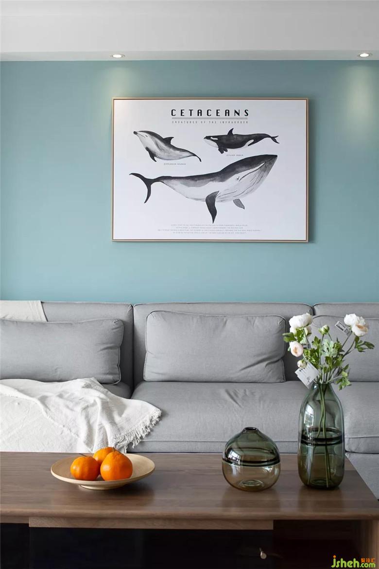 發(fā)背景墻和餐廳墻顏色相呼應(yīng),這個(gè)顏色比大海淺一點(diǎn),蒂凡尼藍(lán)在這個(gè)空間顯得有點(diǎn)小清新。向往大海的自由,那就來(lái)一組鯊魚(yú)的掛畫(huà),讓整個(gè)空間靈動(dòng)起來(lái)。