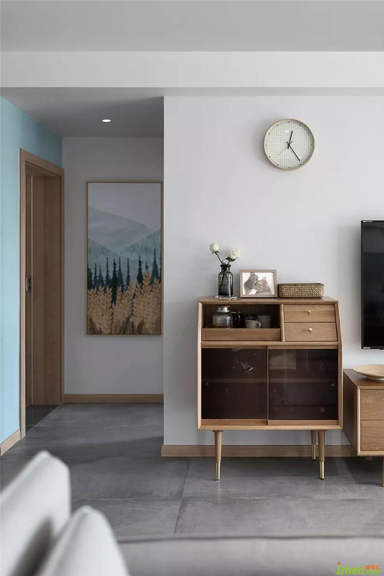 電視墻一角。沒(méi)有復(fù)雜的電視墻造型,擺柜既可以滿足日常的小收納也起到裝飾效果。