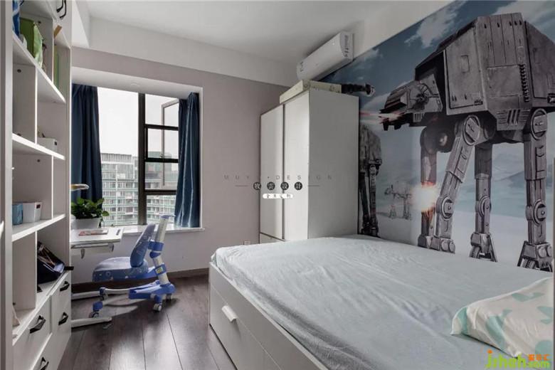 哥哥房間,兒童房幾乎以成品家具為主,方便更換。隨著年齡的增長家具也很好更換,墻面定制墻紙也是哥哥自己選的。