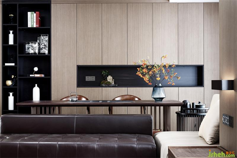 考慮家里老人爬樓不方便,一樓入戶靠右留有一個房間做老人房,離衛(wèi)生間也近。除去一個房間后,客廳的使用面積接近40㎡左右。我們在客廳的一邊設(shè)計了品茶區(qū),環(huán)繞型的布局思路,將空間尺度、功能及實用性無限延伸。