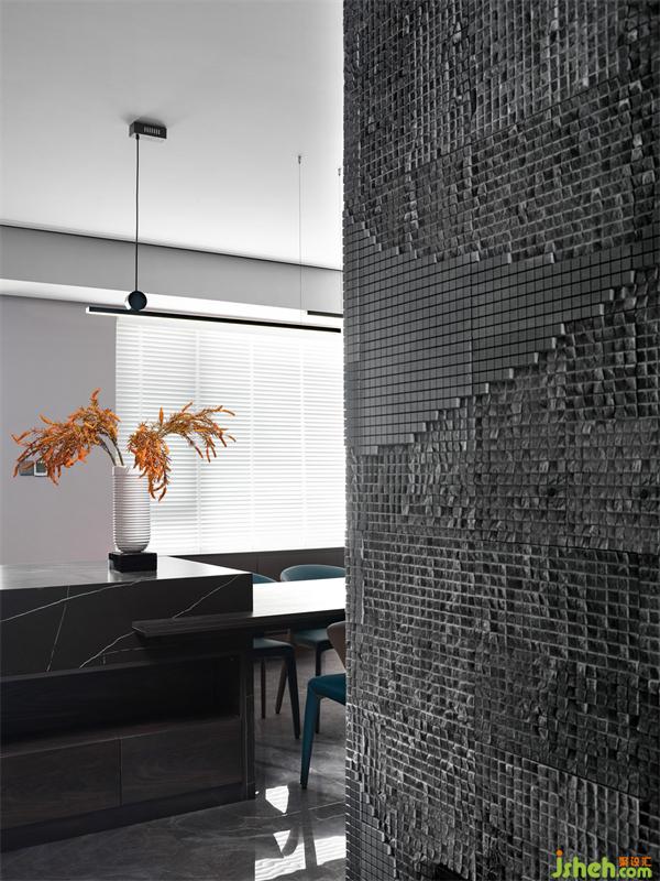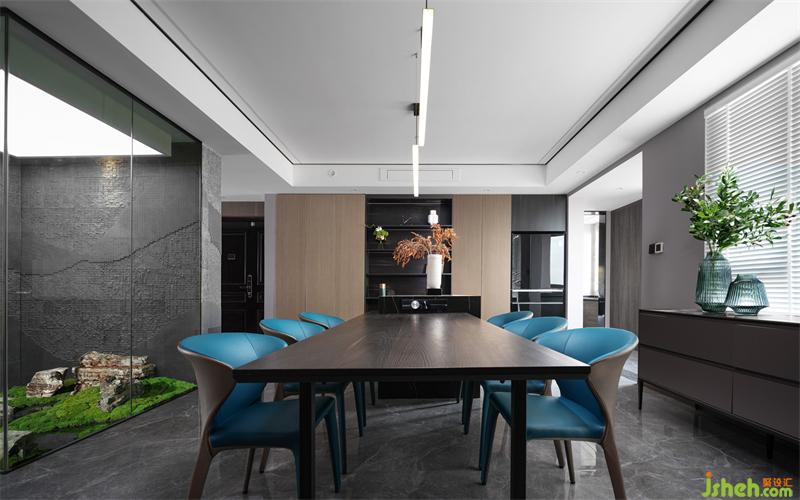 取消掉原玄關(guān)處的儲物間,連接客餐廳,使整個空間更加通透靈動。作為連接客餐廳的中心樞紐,我們選擇在此處造景,同時也解決了此處大方柱的突兀。原設(shè)計做了樹,因風(fēng)水原因改成了太湖石和烘干的苔蘚,綠意濃濃,生機勃勃。
