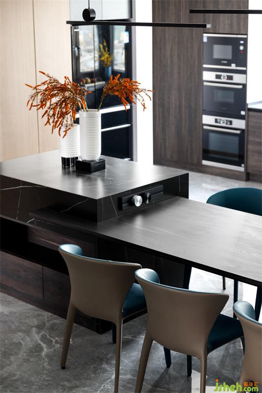 穿行至餐廳,西廚島臺和餐桌共為一體,展開在石影木色中,以自然的紋理、材質(zhì)、線性燈飾點綴修飾,呈現(xiàn)當(dāng)代空間功能整合、美學(xué)并敘的開放式格局。