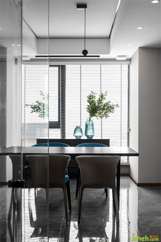 極簡灰風(fēng)格,可不止有黑白灰這么簡單,一些“大膽“的嘗試就能讓居室活躍起來。餐椅的跳躍的藍(lán)色,讓空間不再沉悶。長形大巖板餐桌+島臺的形式,可以容納多人就餐,也可以充當(dāng)手工區(qū)等。島臺上留有電源,可安裝內(nèi)嵌式電磁爐,可以做簡單的早餐及小吃??此坪唵蔚膸缀误w組合,既美觀又具有實用性。