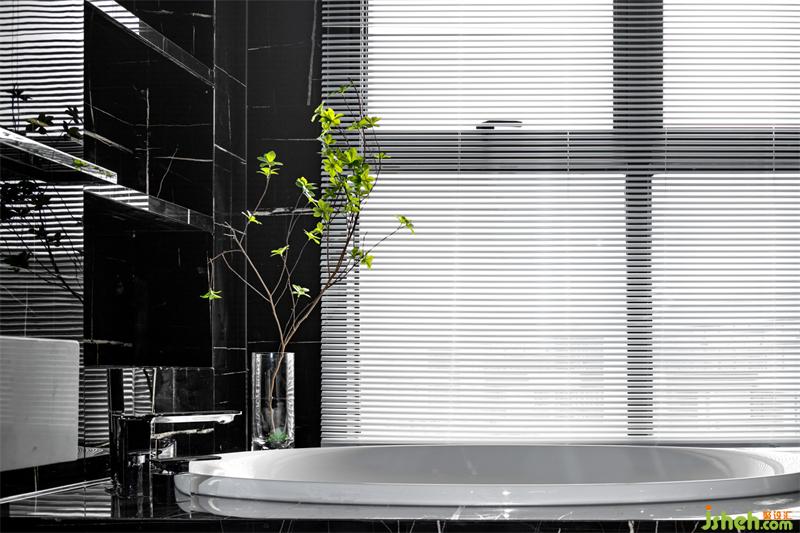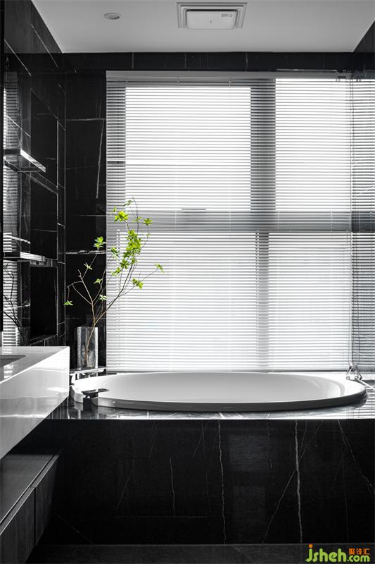 衛(wèi)浴間墻面選用亮面黑色瓷磚,沉穩(wěn)不失優(yōu)雅大氣。窗邊潔白的浴缸,當(dāng)黑白的經(jīng)典搭配,融入現(xiàn)代生活的精致與優(yōu)雅,不浮躁,亦不平庸。