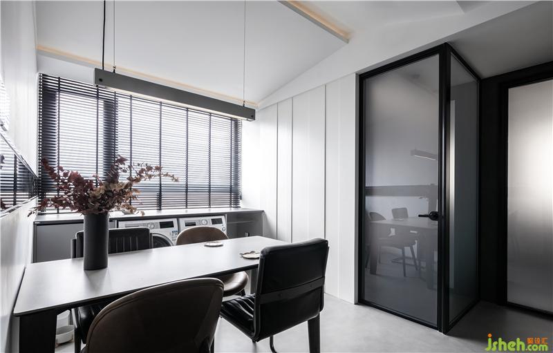 圖中走廊的右邊是黑色玻璃,盡頭是衛(wèi)生間,衛(wèi)生間的門是長虹玻璃門,長虹玻璃通透,透光不透視,可以制造明亮的視覺效果,特別是當(dāng)光打在上面有一種朦朧的美感,配合極窄細(xì)邊框,可以讓空間顯得更大更簡約。衛(wèi)生間的左邊是次臥,次臥的墻體和門采用了玻璃門的樣式,使得其與衛(wèi)生間渾然一體,空間的整體色調(diào)一致。