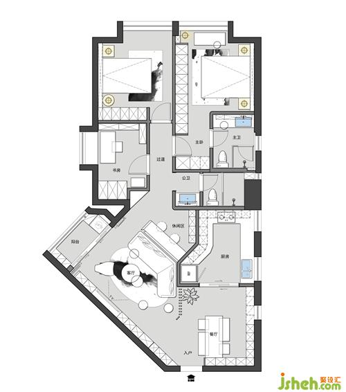 休閑區(qū)為一塊“三角區(qū)”,墻面放置了開放式書柜,兼顧收納和陳列的作用,增加這個(gè)空間的儲(chǔ)物空間,美觀和實(shí)用并存。