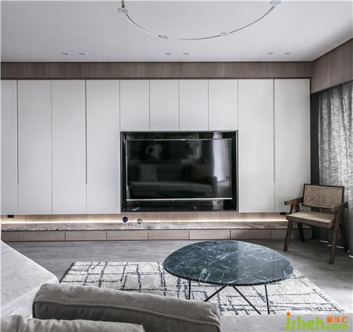 中間內(nèi)嵌電視,整面墻的收納空間,這個(gè)空間的面積實(shí)用做到了最大??蛷d的吊頂做了一個(gè)圓形的造型,在一絲不茍中透露一點(diǎn)小俏皮。