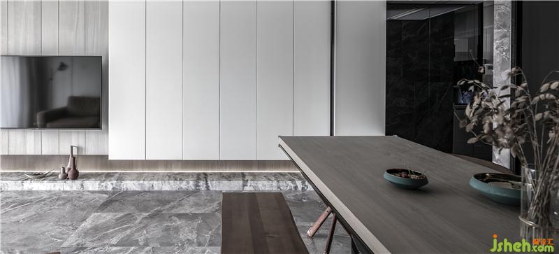 客廳電視背景墻為一整面的儲(chǔ)物柜,柜面為白色烤漆,在吊柜的兩邊都有黑色不銹鋼作為見光板,深圳室內(nèi)設(shè)計(jì)師以此作為兩個(gè)材質(zhì)中間的界限??臻g延申感十足,使得空間更加通透,使得整面墻干凈整潔。在電視底部背景使用了淺色木飾面,把線路以及網(wǎng)絡(luò)線全部隱藏在背景內(nèi)部,下方地臺(tái)為大理石,在里面一整條的燈帶用以勾勒形狀以及渲染氛圍,懸空的地方可以放置一些小擺件,背景為較深一些的木飾面。在簡(jiǎn)簡(jiǎn)單單的一面電視背景墻上是有著三種材質(zhì)背景,使得電視墻的層次感豐富起來(lái)了。