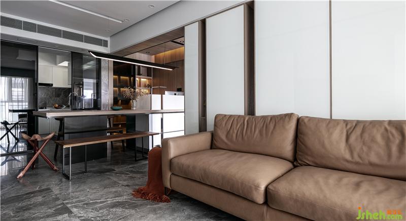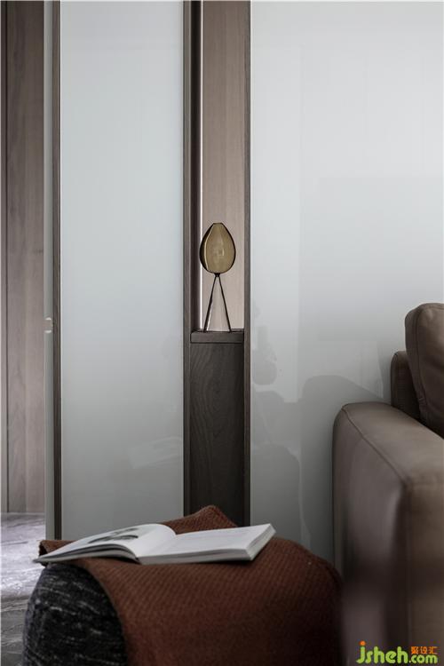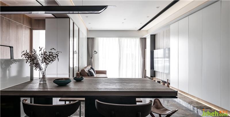 沙發(fā)背景墻為白色玻璃,中間為木色層板,可以擺放小擺件飾品。最邊上單列的儲(chǔ)物柜的柜門朝向餐桌方向,往里的中間部分的柜子開門方在背面,深圳室內(nèi)設(shè)計(jì)師以此讓沙發(fā)背景墻顯得有層次,白色與木色的配合,讓空間顯得十分有質(zhì)感。