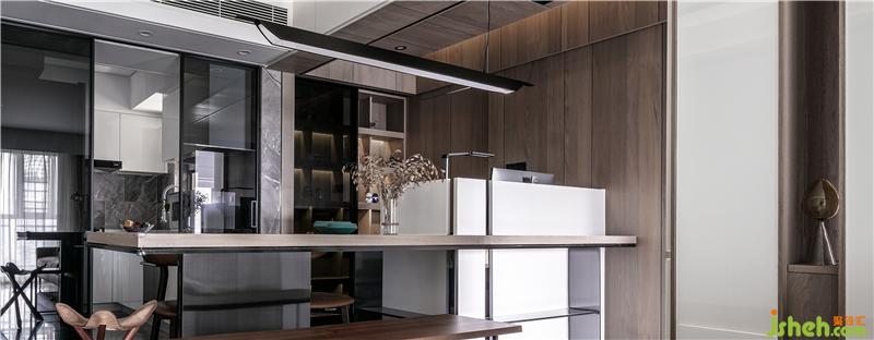 餐廳的整體背景為木色,一整面的木飾面,做了隱形門的設(shè)計(jì),避免了過(guò)道小區(qū)域的空間碎片化,將次臥的門以及衛(wèi)生間的門很好的隱藏起來(lái)了。在餐桌旁邊是書桌,以白色的高擋邊區(qū)分開兩個(gè)分區(qū)。在書桌后面是一整面的書柜,是實(shí)木層板與深色玻璃組成,柜體材質(zhì)為實(shí)木,推拉玻璃門給人很強(qiáng)的高級(jí)感,為空間帶來(lái)寬敞的通透質(zhì)感,采用的是一門到頂?shù)脑O(shè)計(jì)。