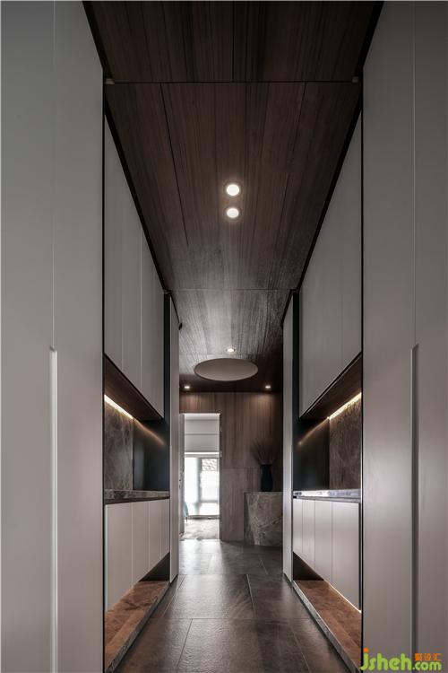 一整排的頂天立地柜,中間一部分柜子下方懸空,底部大理石地臺挑高,配合底部暗藏?zé)魩В魅蹩臻g壓抑感又?jǐn)U大了整體空間感。中空可放置雜物、飾品擺設(shè)。下方可放置鞋子。白色烤漆柜門,柜子采用了無拉手設(shè)計(jì),中空部分采用了大理石做臺面,吊柜底部為木飾面,兩側(cè)用黑色不銹鋼收口。木質(zhì)與大理石的搭配,顯得沉穩(wěn)又有高級感。