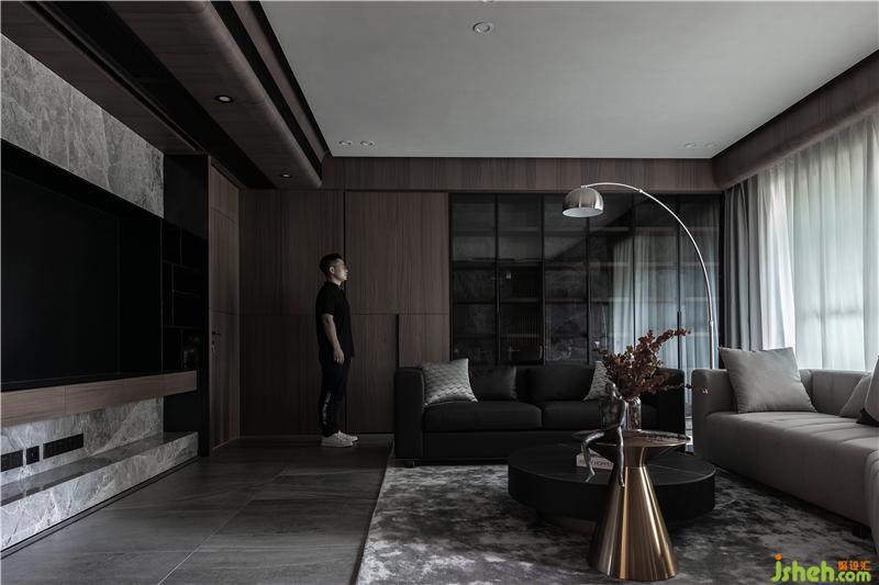 如圖上所見,電視背景墻下發(fā)光部分是蒸汽壁爐,給整體沉穩(wěn)的色調(diào)帶來一絲煙火氣。