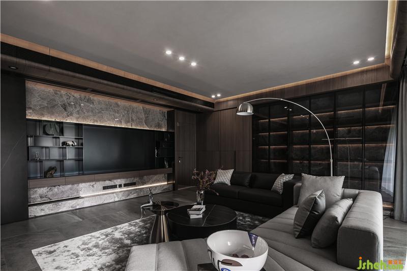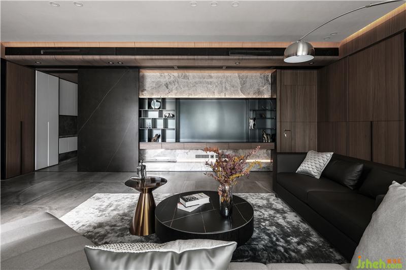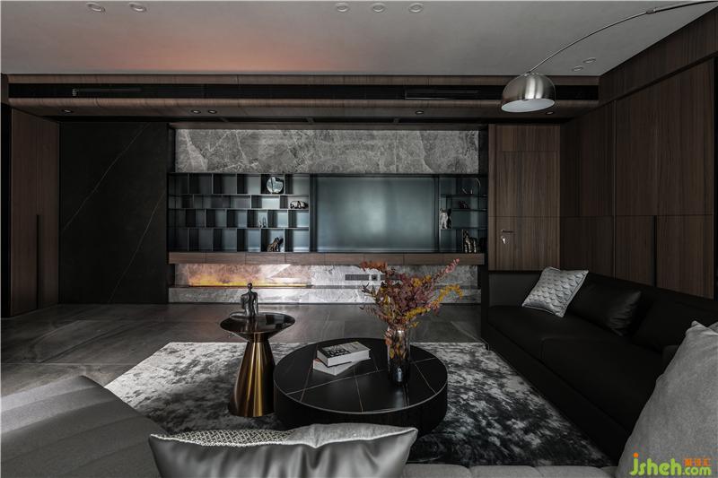 電視背景墻為白底灰紋的大理石臺面,下方為250mm高的抬高,用于放置機(jī)頂盒和音響。電視下是木飾面的層板,兩側(cè)用黑色不銹鋼收邊,冷色與暖色的碰撞,室內(nèi)設(shè)計(jì)師以沉穩(wěn)的黑色作為白色與木色之間的分界,既為效果做緩沖,也使空間更有整體性。