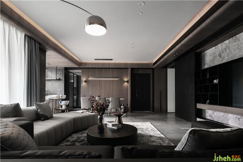 圖為巖板移門效果,作為動區(qū)與靜區(qū)的隔斷,黑色巖板更加硬實(shí)、更加隔音。