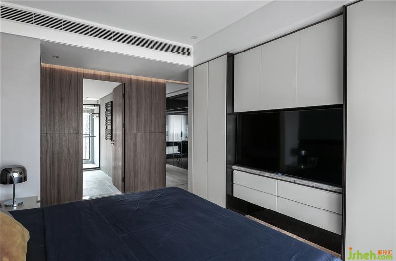 主臥的電視背景墻為一排白色烤漆板的柜子,增加了收納空間。