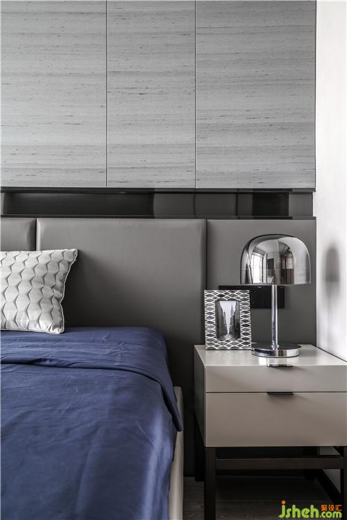 Owners like blue, and require that the bigger the bed, the better. We use dark gray tone with wood floor, paved with light to create atmosphere, dark bedroom can let people into sleep state. The soft package and hard package of the background wall at the head of the bed are combined with the stainless steel in the middle. It reveals a sense of delicacy.