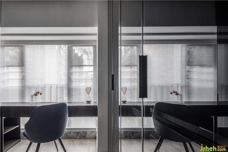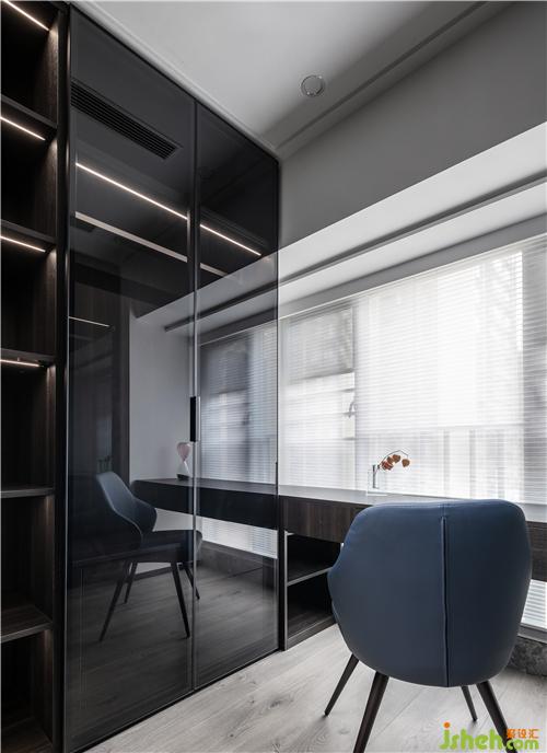 衣帽間由實木層板與深色玻璃相結(jié)合,體現(xiàn)著現(xiàn)代藝術(shù)的碰撞。柜體材質(zhì)是木飾面,玻璃門與黑色金屬拉手,給人很強的高級感,工藝細膩彰顯簡約品質(zhì)。金屬加玻璃的組合,為空間帶來寬敞凈透質(zhì)感,采用了一門到頂?shù)脑O(shè)計。