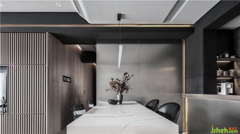 相鄰的開(kāi)放式輕吧區(qū),以不銹鋼確立分界,輔以木色的臺(tái)面。餐廳的墻面整面是不銹鋼,在與吧臺(tái)區(qū)的墻面處藏有燈帶。餐桌是白色大理石,桌腿是不銹鋼造型,這兩旁是一對(duì)皮子靠椅和一對(duì)灰色透明亞克力的椅子。