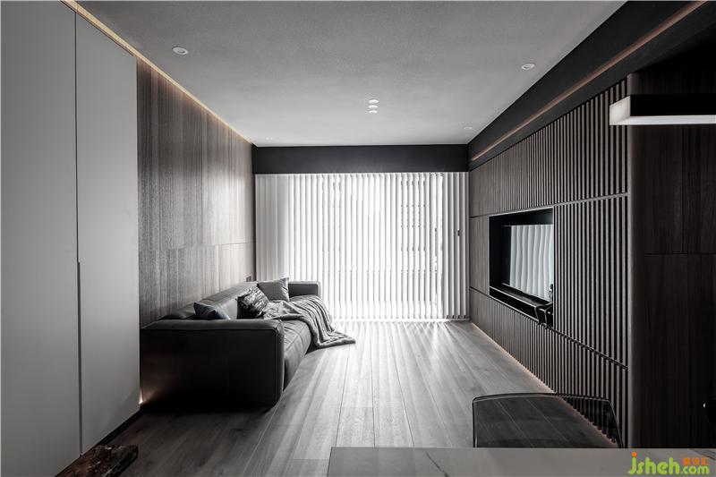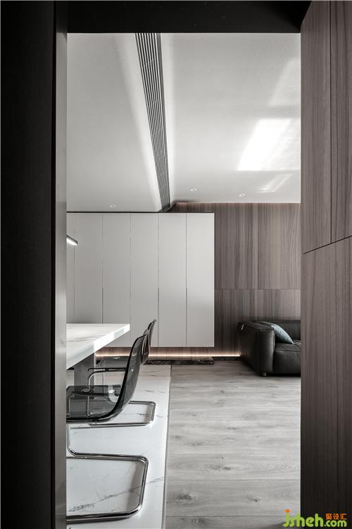 多功能室的書(shū)柜運(yùn)用玻璃推拉門(mén),百葉窗讓充足采光穿透到客餐廳。整個(gè)空間采用黑白+木色為色調(diào),營(yíng)造出最干凈溫和的視覺(jué)觀感。半開(kāi)放式的多功能室是對(duì)空間“關(guān)系”的思考,互通性與私密性共生。黑色的線條流動(dòng)其中,用線條構(gòu)建簡(jiǎn)潔的利落感。