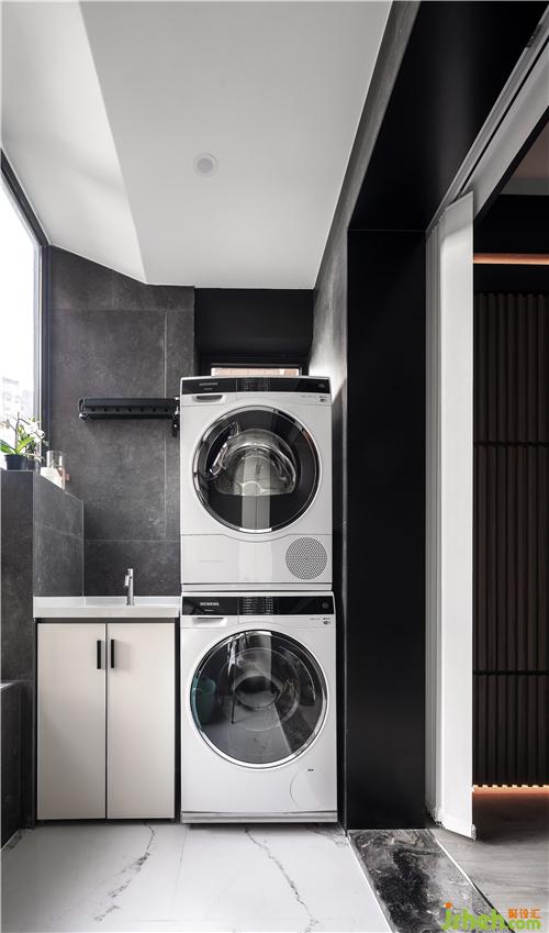將洗衣機(jī)安置在陽(yáng)臺(tái),減少使用時(shí)對(duì)屋內(nèi)的影響,定制儲(chǔ)物柜將洗衣機(jī)嵌入其中,將收納進(jìn)行到底。陽(yáng)臺(tái)地面鋪貼白色大理石的地板磚,結(jié)實(shí)耐用且便于打理。