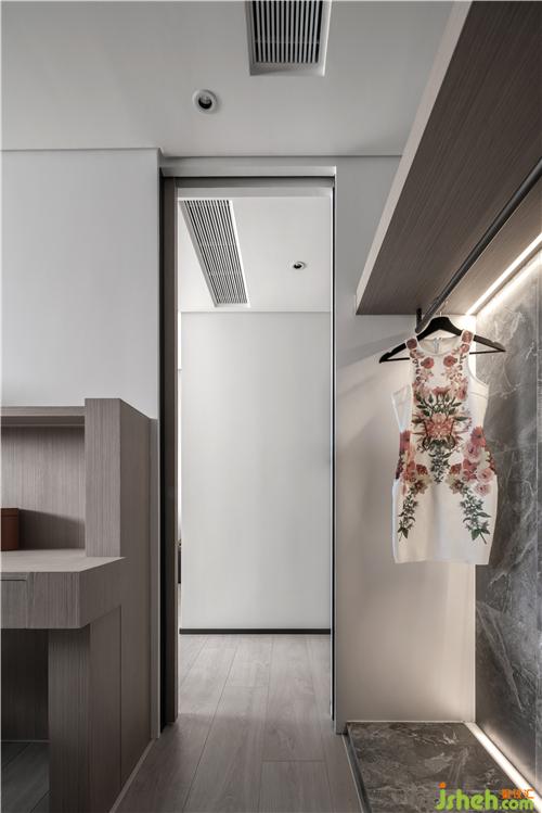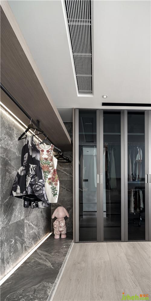衣帽間采用開(kāi)放格與封閉柜門結(jié)合的方式,滿足客戶對(duì)于不同衣物的收納,加入線性燈更加便于衣物的拿放。