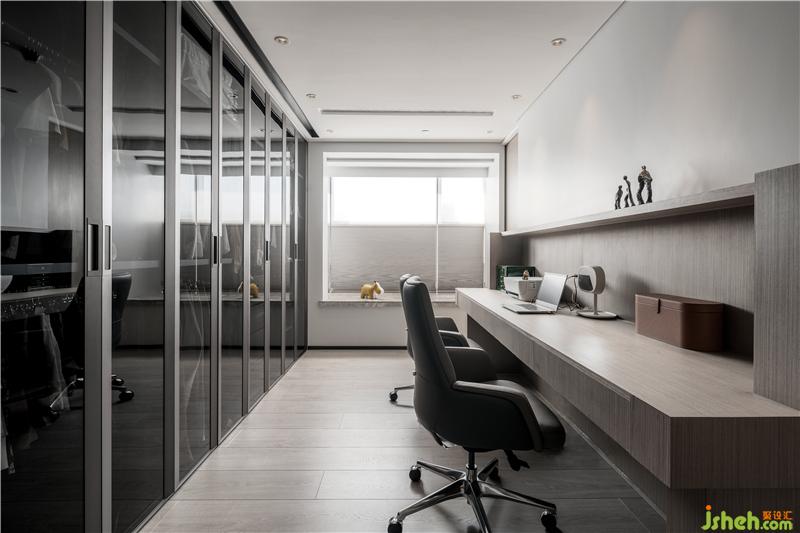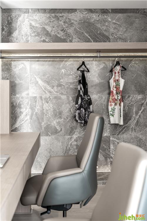 衣帽間在主臥內(nèi),利用書(shū)桌結(jié)構(gòu)設(shè)置了隱形門,形成環(huán)形動(dòng)線,隱形門關(guān)起來(lái)畫(huà)面是整體性的,打開(kāi)之后可以互相對(duì)話。
