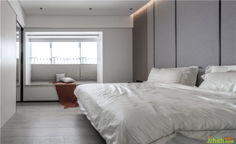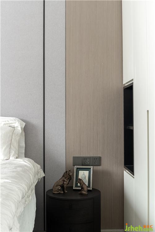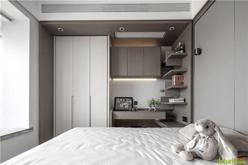灰藍(lán)色的床頭背景搭配干凈明朗的床品,極簡(jiǎn)的落地?zé)敉ㄟ^(guò)墻體反射光照明,光線更柔和,深圳裝修設(shè)計(jì)營(yíng)造一個(gè)溫馨的睡眠空間。