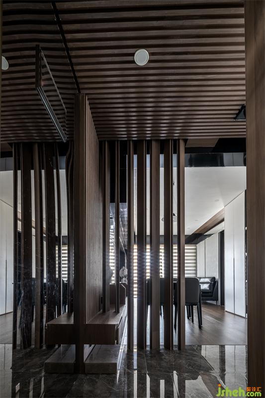 進(jìn)入玄關(guān),木格珊錯(cuò)落立在餐廳旁邊作為客廳的屏風(fēng)