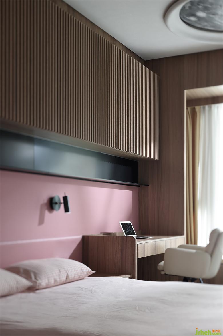 兒童臥房延續(xù)沉靜的格調(diào),將睡眠、儲物、展示融為一體。考慮孩童成長的周期,加高飄窗地臺,兼顧多種使用功能。白色、粉色與木色的主色透過墻面、柜體、家具得以延續(xù)。窗外湛藍(lán)的天空如畫舒展。簡潔、平靜、永恒是本案設(shè)計最突出的氣質(zhì),木子仁設(shè)計整體設(shè)計側(cè)重于空間情境的營造,素雅樸質(zhì)為表,內(nèi)里追求精神的自由與灑脫。