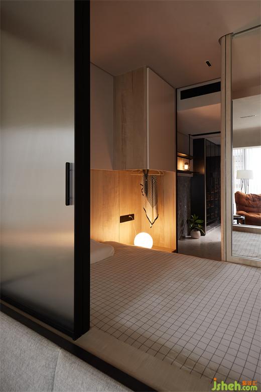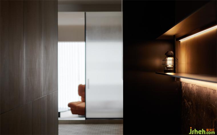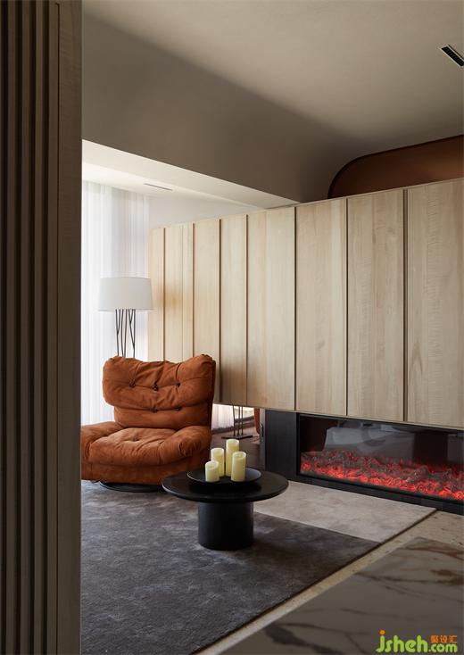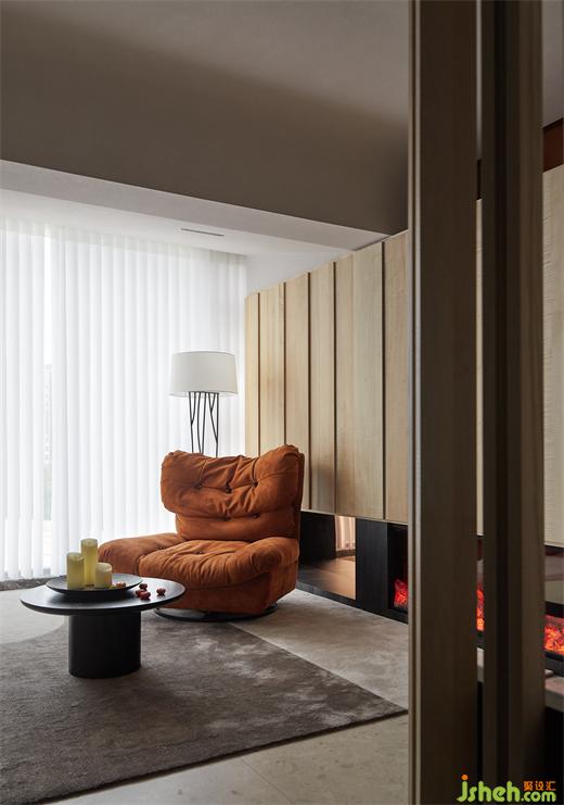 客廳面以一個(gè)現(xiàn)場制作木格柵為屏風(fēng)的工藝呈現(xiàn),有著粗獷的感覺。黑色的幾何形制桌體搭配簡約卡座,豪宅設(shè)計(jì)配上黃棕色溫暖色系單人沙發(fā),簡單不失溫馨,頗具意境。