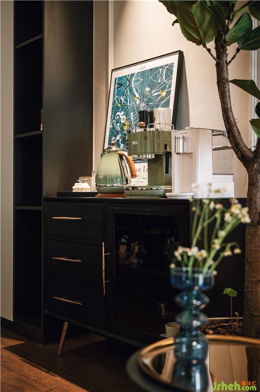 以復(fù)古的石膏盤搭配弧形吊燈,將無(wú)主燈客廳與餐廳相區(qū)分,簡(jiǎn)約的黑色圓桌與藤編椅,與餐桌上的燭臺(tái)、花束、桌旗等搭配相得益彰。餐廳處設(shè)有一電表箱,用以可開(kāi)合的裝飾畫所覆蓋,畫上貼有夫妻倆行走過(guò)足跡照片,整個(gè)餐廳的氛圍都變得溫暖且有格調(diào)。裝修設(shè)計(jì)