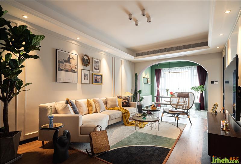 無(wú)主燈設(shè)計(jì),使客廳空間更開(kāi)闊,墻面以白色為主,添加了石膏線,增添了房屋的立體感。所有地面均采用木地板,比地磚會(huì)更有溫度,客廳異形沙發(fā)與室內(nèi)植物相連接,讓整個(gè)空間更具有生機(jī),也有屏風(fēng)隔斷的作用。陽(yáng)光穿過(guò)落地窗灑入屋內(nèi),與一盞懷舊復(fù)古的落地小臺(tái)燈微弱的光,交相輝映。這斑駁的光影,靈動(dòng)且恬靜,讓家具與藝術(shù)品的結(jié)合更加出彩。