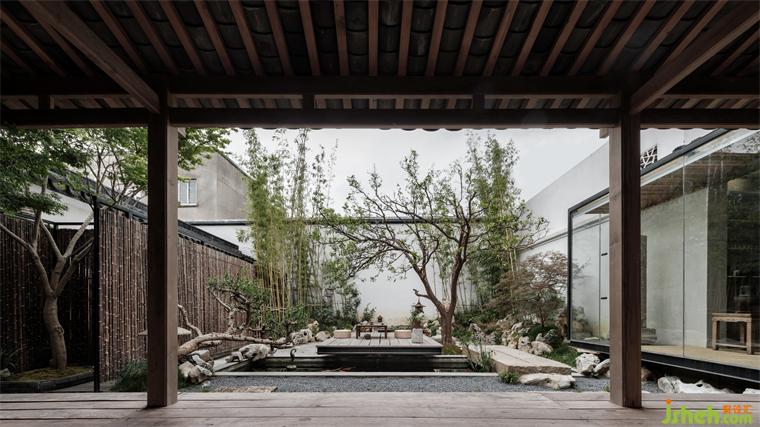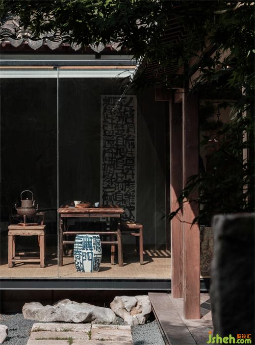 兩面是房屋,一面落地玻璃。正對院門,視覺上延伸出幽遠(yuǎn)之意。
