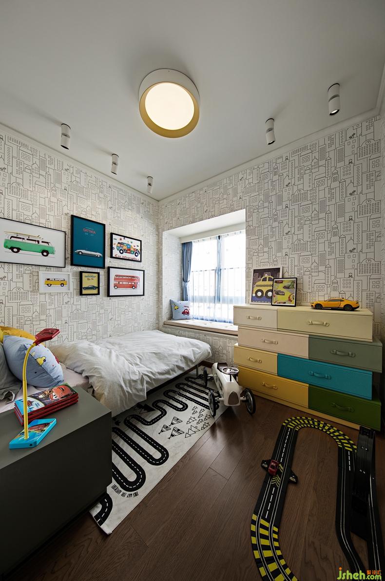 城市主題墻紙搭配車元素掛畫組合,賽道地毯、抱枕、臺燈、車模擺件等,豐富的空間層次感且童趣十足完美地演繹了汽車主題兒童房,設(shè)計(jì)同時留出最大的活動空間,讓孩子可以在此盡情的玩耍。