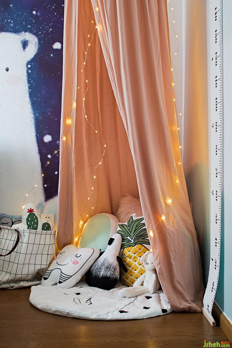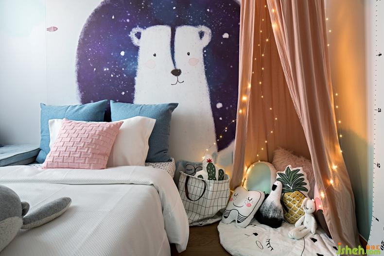 女孩房色調(diào)溫馨,卡通壁紙小帳篷都簡單有型實(shí)用同時(shí)也給人一種時(shí)尚感,豐富的配色,樣式各異的小抱枕,柔軟的小床,讓小主人無憂無慮的享受玩耍時(shí)光。
