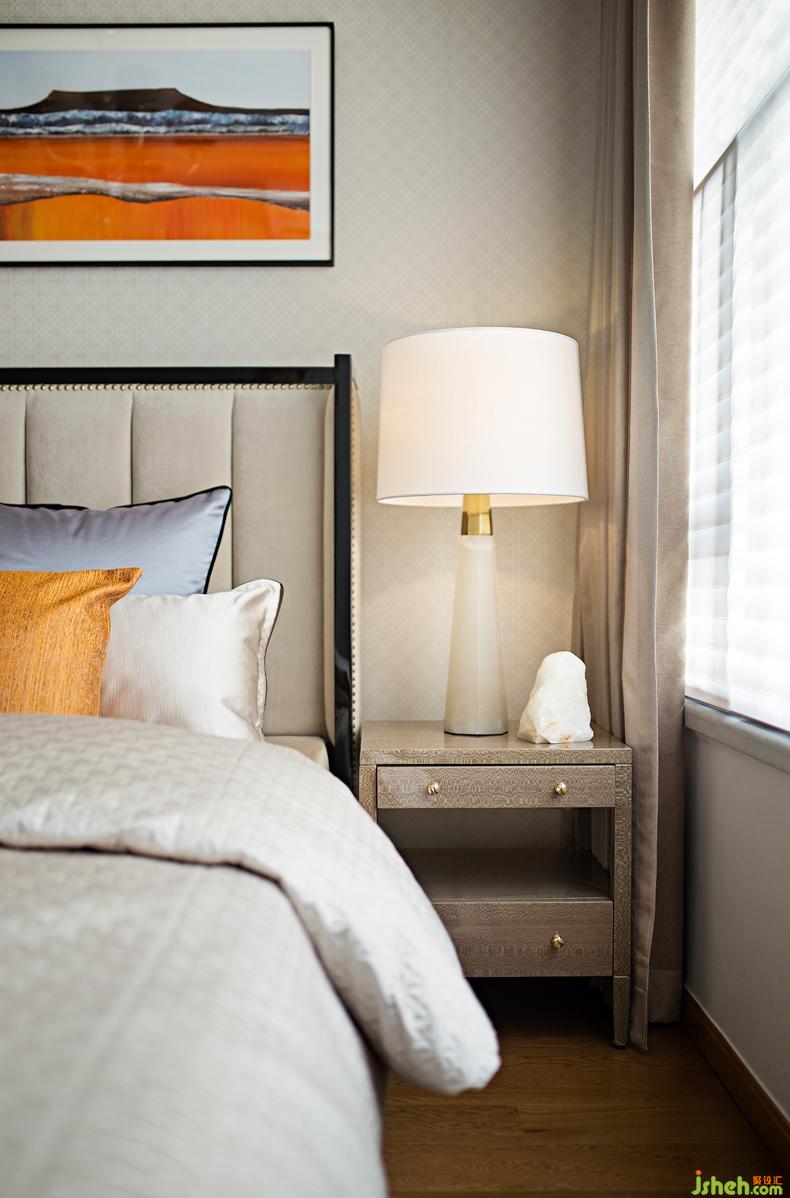 次臥沉穩(wěn)溫潤的米色軟包床搭配抽象掛畫藝術(shù)感十足,舒適高端的定制床品布藝讓居者身臨其境的感受奢華魅力