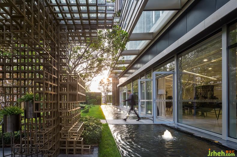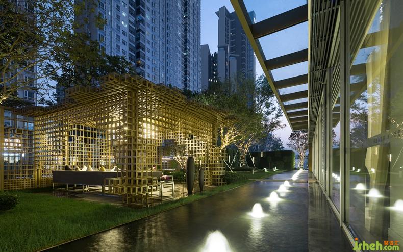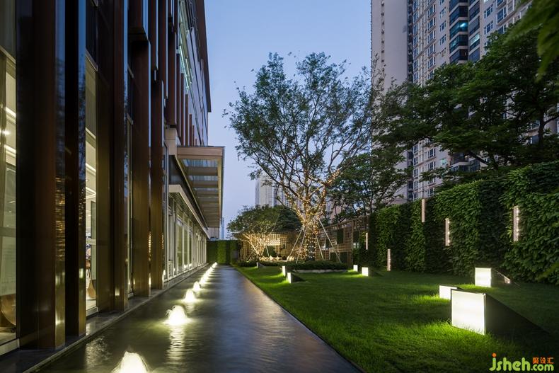 連綿的地景,搭配輪廓分明的音樂草地燈,設(shè)計公司通過這些簡單而微妙的關(guān)聯(lián),與整體設(shè)計元素相呼應。綠植墻的設(shè)計讓綠在立面上得以延續(xù),塑造出了空間的多維層次感。
