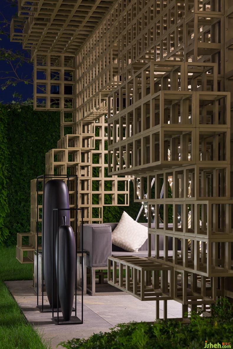 大小各異的水晶光斑體塊圍合成一個獨特的景觀亭,同時也可作為展示空間使用。設(shè)計公司體塊組合、連續(xù)、重疊的變化,形成舒適均衡的視覺效果。